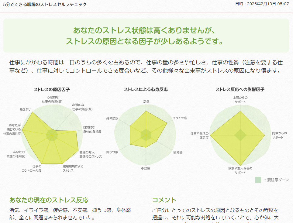 働く人のメンタルヘルス・ポータルサイト「こころの耳(厚生労働省委託事業)」から、「5分でできる職場のストレスセルフチェック」の結果シートに、厚生労働省「労働安全衛生法に基づくストレスチェック制度実施マニュアル」の評価基準に沿った「高ストレス者」の該当であることが表示されるようになったとのお知らせがありました(令和8年1月13日公表)。